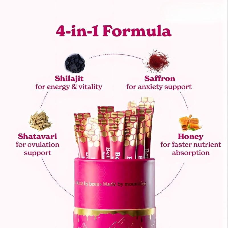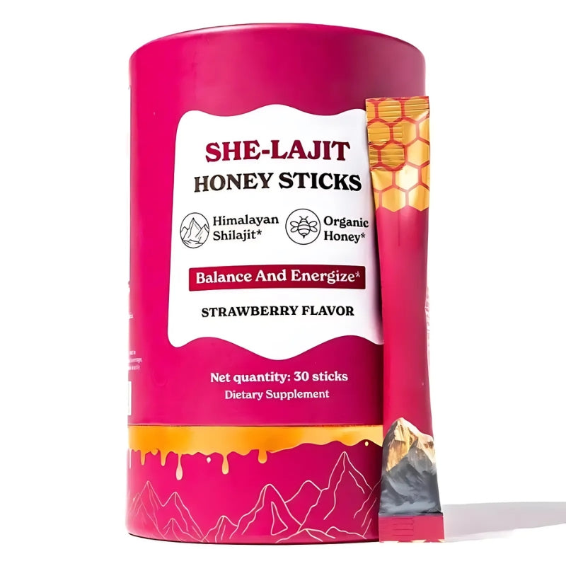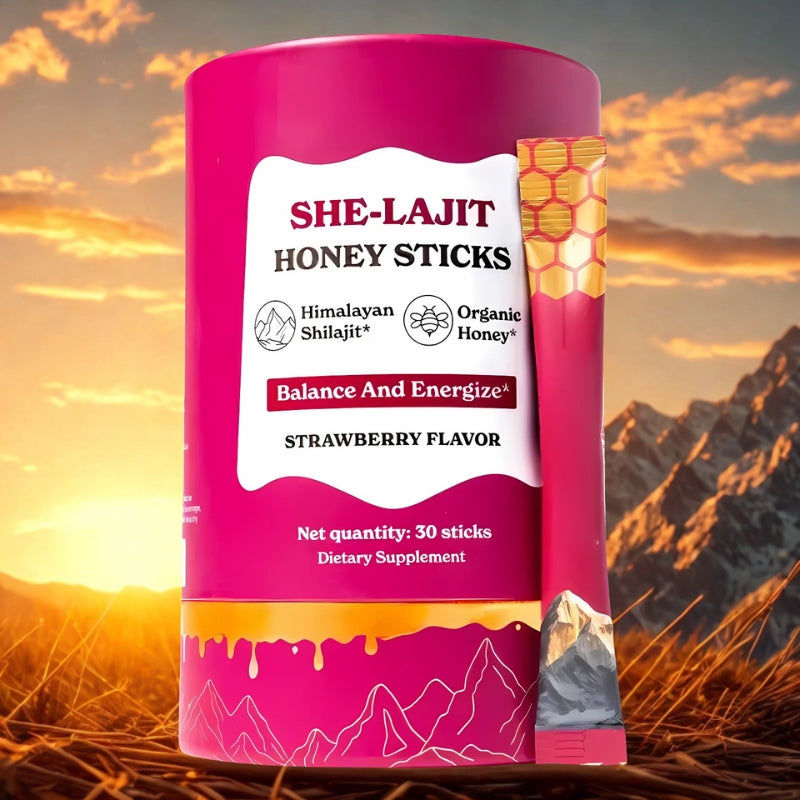 She-Lajit Honey Sticks combine the ancient wisdom of Himalayan Shilajit with potent botanicals like Shatavari, Saffron, and pure organic honey to nourish feminine health, naturally.